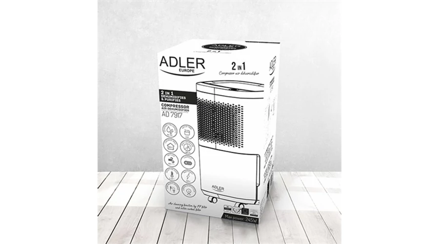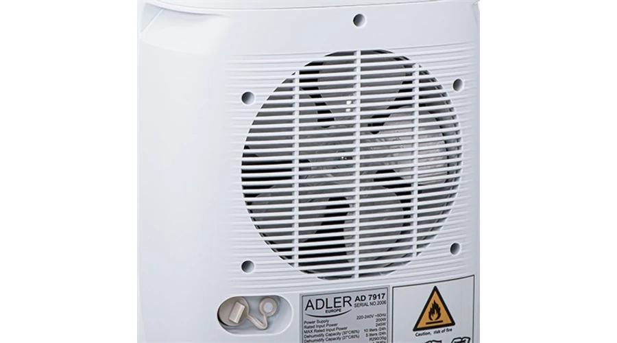 Az AD 7917 egy kompresszoros párátlanító, napi 10 liter víz kapacitással. A készüléket úgy tervezték, hogy csökkentse a páratartalom szintjét olyan helyiségekben, mint a fürdőszobák, szárítók, szekrények. Segít fenntartani a megfelelő páratartalmat olyan könyvtárakban, múzeumokban, levéltárakban, kiszolgáló helyiségekben és más helyiségekben, ahol a levegő túl sok nedvességnek van kitéve. Jól működik alacsonyabb emeletek, például pincék és garázsok párátlanításakor. A mosókonyhában való használata jelentősen felgyorsítja a ruhák szárítását.Az AD 7917 egy kompresszoros párátlanító, napi 10 liter víz kapacitással. A készüléket úgy tervezték, hogy csökkentse a páratartalom szintjét olyan helyiségekben, mint a fürdőszobák, szárítók, szekrények. Segít fenntartani a megfelelő páratartalmat olyan könyvtárakban, múzeumokban, levéltárakban, kiszolgáló helyiségekben és más helyiségekben, ahol a levegő túl sok nedvességnek van kitéve. Jól működik alacsonyabb emeletek, például pincék és garázsok párátlanításakor. A mosókonyhában való használata jelentősen felgyorsítja a ruhák szárítását.