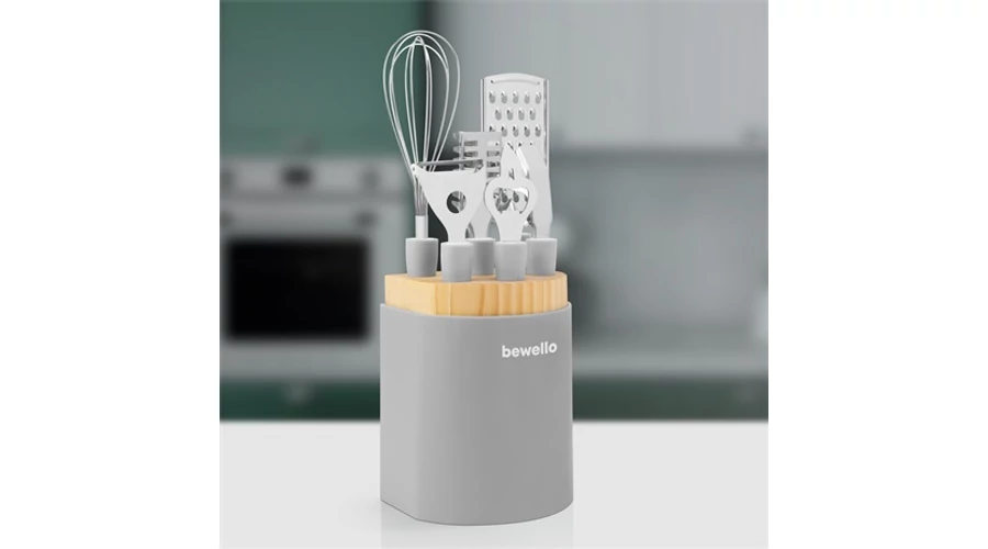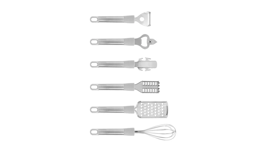 Rozsdamentes acél nyéllel rendelkező konyhai eszköz szett. Helytakarékosan, könnyen áttekinthetően tárolhatja a mindennapi használati eszközeit. A főzés szinte minden területét lefedő készletben talál többek között habverőt, sajtreszelőt, zöldséghámozót, halpikkely eltávolító eszközt, sörbontót, konzervbontót is.