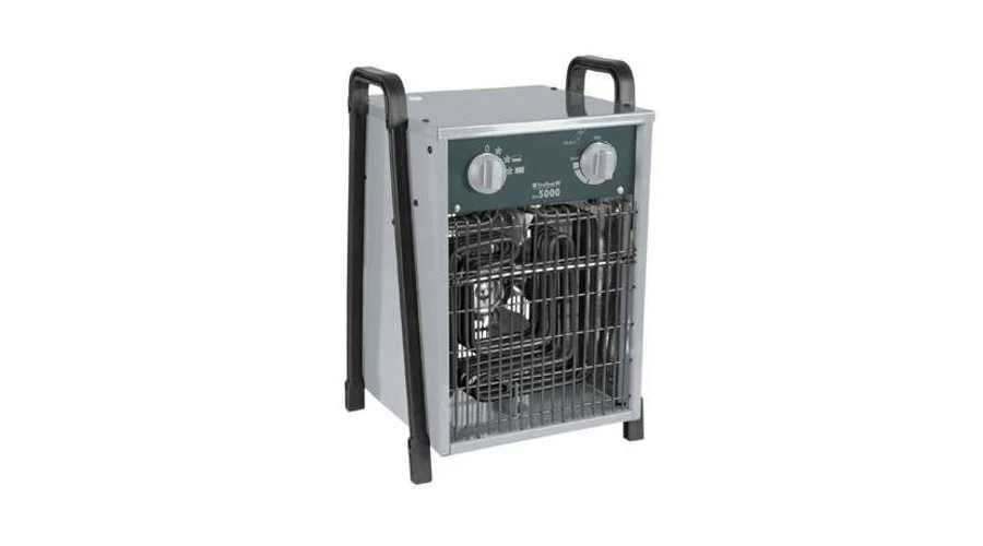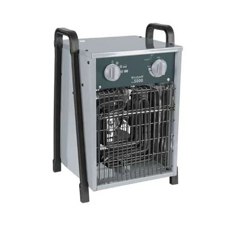 Az EH 5000 elektromos hőlégfúvó nagy teljesítményű álló fűtőkészülék különleges, fémanyagú fűtőelemekkel. Ideálisan alkalmas műhely, kisebb raktárak, partisátrak gyors fűtésére vagy helyiségek gyors szárítására. Két hőfokozat (2500/5000 W) és fokozatmentesen állítható termosztát segít a kívánt helyiséghőmérséklet kényelmes beállításában. A fröccsenő víz ellen védett EH 5000 elektromos fűtő alumínium szellőzőkerekes, nagy teljesítményű axiális légfúvó. A légkieresztő rács porfestett fonott drót, a ház hátfala horganyzott anyagú. A ventillátor továbbfutása biztosítja a fűtőelemek használat utáni lehűtését, és erős tartólábak gondoskodnak a készülék stabilitásáról. A beépített termikus védelem is biztonságos működést garantál, mert az EH 5000 automatikusan kikapcsol, amint túlmelegszik. 400 V / 16 A CEE-dugó segítségével indulhat az üzem, a beépített fogó pedig könnyű szállíthatóságot biztosít.