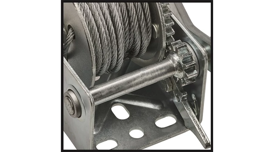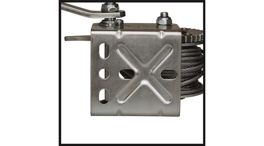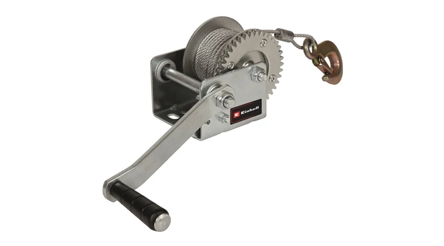 Az Einhell TC-WI 500 kézi csörlő maximális terhelhetősége 500 kilogramm. A gyári csomagolás tartalmazza a 10 méter hosszú, csavarodásmentes drótkötelet (O 4,2 mm) és a biztonsági karabinerrel felszerelt horgot is. A biztonsági karabiner megakadályozza, hogy a rögzített teher ki- vagy lecsúszhasson a horogról. A kilincsmű segítségével biztonságosan megállíthatja a kötelet és a terhet. A kézi hajtókar Softgrip borítású, ami erős fogást és kényelmes munkavégzést garantál. A csörlőt egyszerűen rögzítheti a lemezen található furatok segítségével.