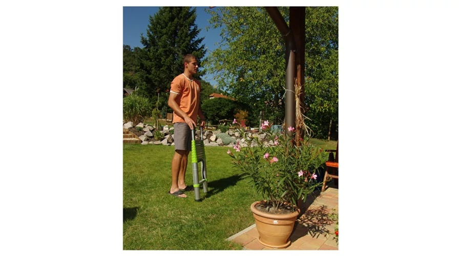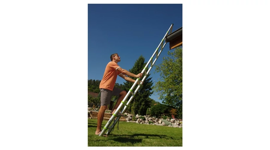 A létra egyedülálló teleszkópos rendszerének köszönhetően nagyon népszerű a ház- és kerttulajdonosok körében. A létra minimális helyigénnyel dicsekedhet, összecsukott állapotban 81 x 48 x 8 cm helyet foglal, a kezelése könnyű és kényelmes. Speciális konstrukciója és a megfelelően kiválasztott anyagok gondoskodnak nagy stabilitásáról teljesen kihúzott állapotban is, maximum 150 kg megterhelést bír, és 3,2 m-ig kihúzható.