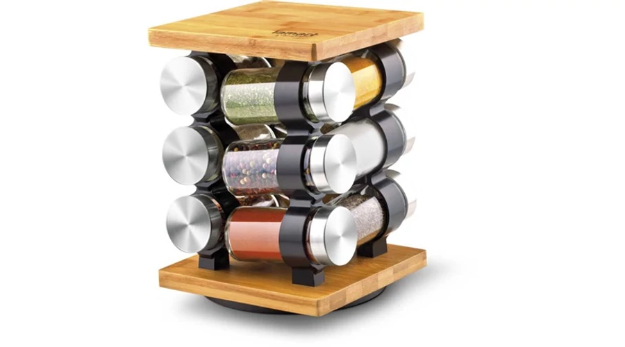 - Modern formatervezésű fűszertartó készlet forgatható bambuszállványon.
