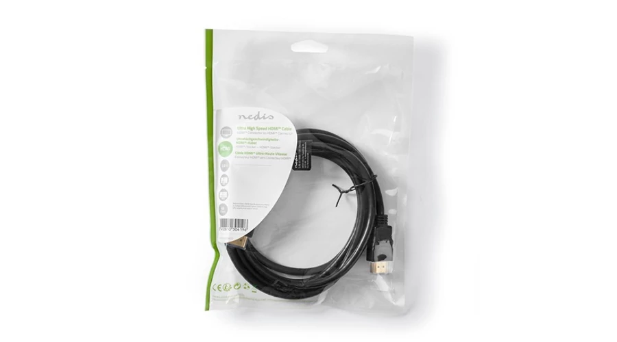 A Nedis® új Ultranagy Sebességű HDMI™-kábele támogatja a 48 Gb/s sávszélességet. A kábel biztosítja a nagy sávszélességet igénylő funkciók működését, beleértve a tömörítetlen 8K videó átvitelét HDR képpel. Rendkívül alacsony EMI-értékkel (elektromágneses interferencia) rendelkezik, ami csökkenti a közeli vezeték nélküli eszközökkel való interferenciát. A kábel kompatibilis az alacsonyabb specifikációjú termékekkel, és használható a már meglévő HDMI-eszközökkel.