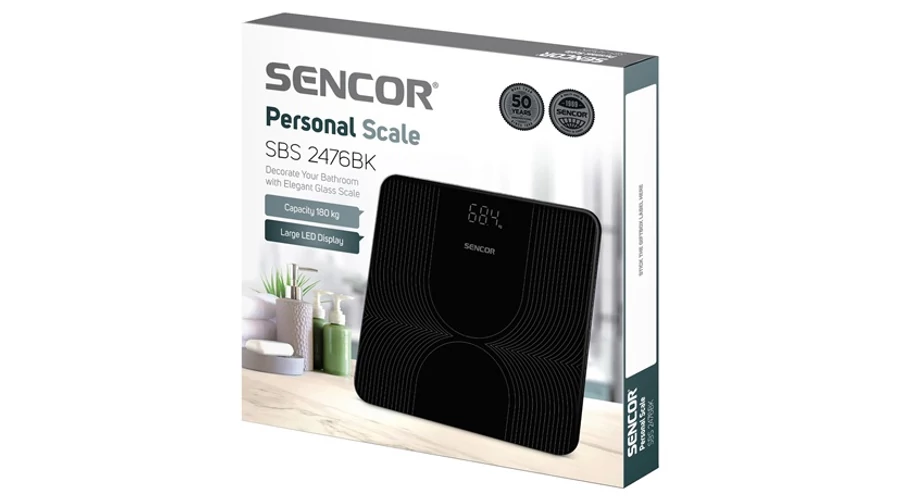 A Sencor SBS 2476BK személymérleg kiváló ár és érték arányt képvisel. Letisztult, elegáns stílusának köszönhetően minden fürdőszobába könnyen beilleszthető kiegészítő. Segítségével a család minden tagja nyomon követheti az éppen aktuális testtömeg értékét. A fürdőszoba mérleg edzett üveg borítása 5 mm vastag. Beépítésre került 4 szenzor, amely a pontos méréshez járul hozzá. A maximális terhelhetősége pedig 180 kg és ehhez 100 g-os mérési pontosság társul. Az üveg felületnek köszönhetően tisztítása egyszerűen elvégezhető.