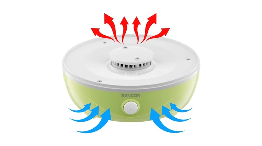 A szárítógép közepén egy beépített ventilátor található, amely biztosítja az összes behelyezett hozzávaló egyenletes szárítását. A ventilátor meleg levegőt hoz létre a felső emeletekre és az oldalakra egyaránt. A sziták közötti magasságot 3 cm-re állíthatja, így minden méretű finomság elfér a szárítóban.