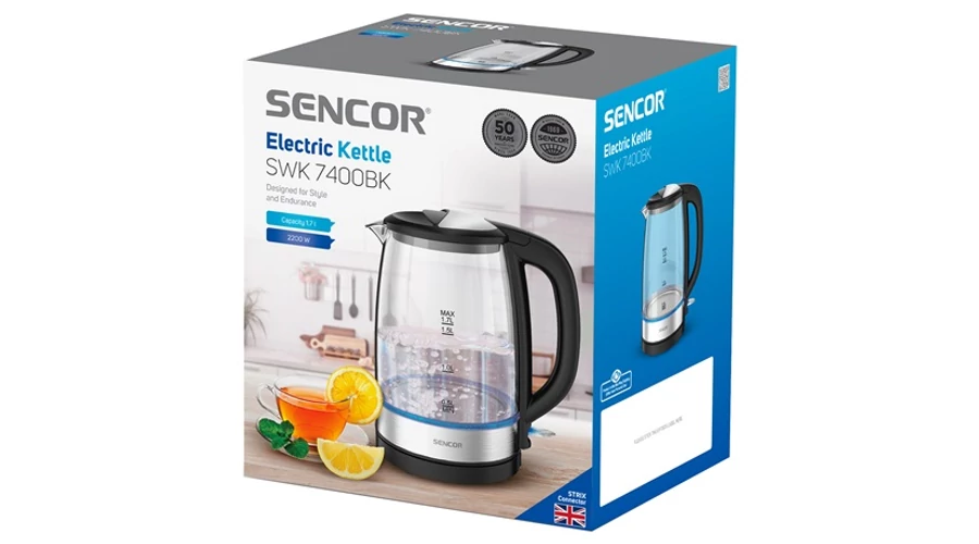 A Sencor SWK 7400BK stílusos vízforraló kiváló kombinációja az eleganciának és a praktikusságnak. A maximális kapacitása 1,7 liter és az anyagát tekintve kiváló minőségű hőálló borszilikát. A vízforraló 2200 W teljesítményének köszönhetően gyorsan felmelegíti a vizet.