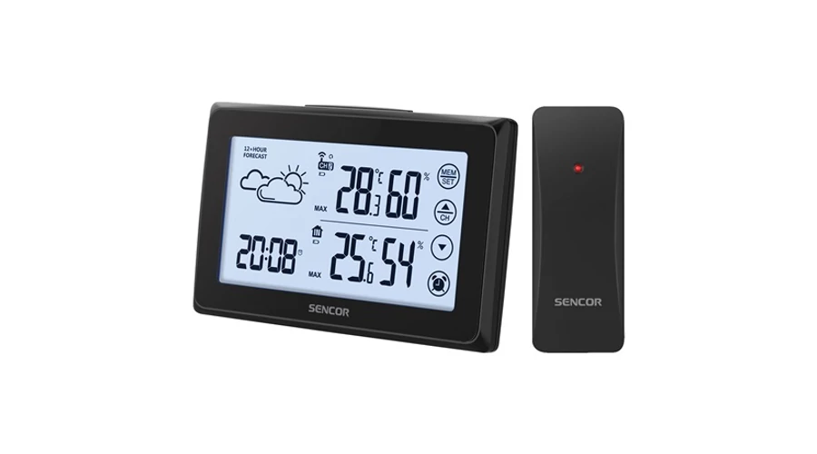 A Sencor SWS 2850 időjárás állomás alkalmas a páratartalom és hőmérséklet beltéri és kültéri mérésére. Az LCD-kijelzőn látható a pontos idő és dátum, valamint a hét aktuális napja is. Lehetőség van ismétlődő ébresztés beállítására. Akár 50 méteres távolságig is képes az adatátvitelre. 12 és 24 órás időformátum megadásának lehetősége, valamint a hőmérséklet °C és °F fokban is megjeleníthető