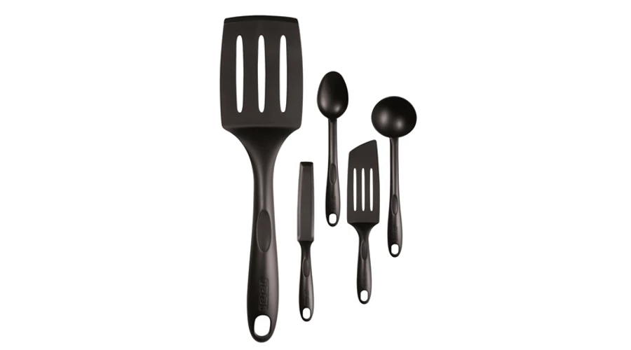 5 db-os konyhai eszközkészlet – Ferde forgatólapát: halak és húsok forgatásához – Palacsintaforgató lapát: palacsinták forgatásához – Kanál: főzéshez és az ételek felszolgálásához – Hosszú forgatólapát: halak főzéséhez és felszolgálásához – Merőkanál: folyékony ételek felszolgálásához