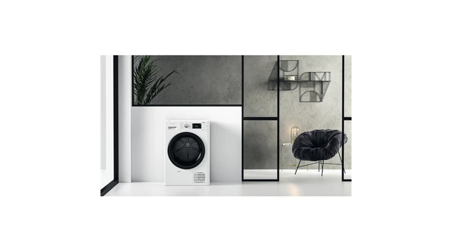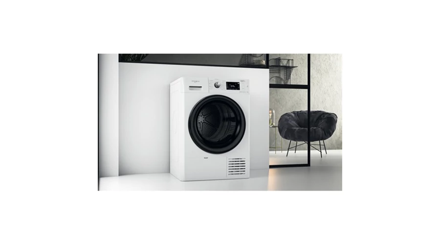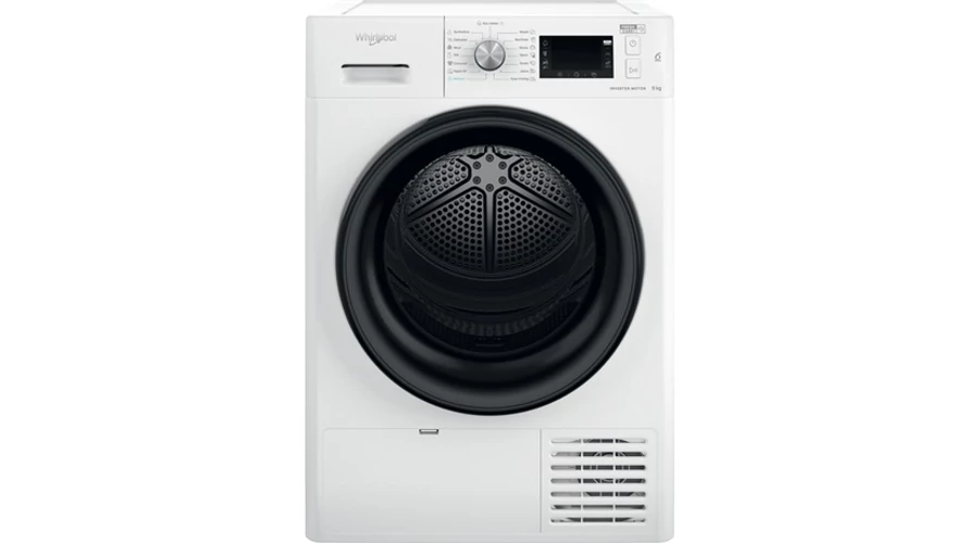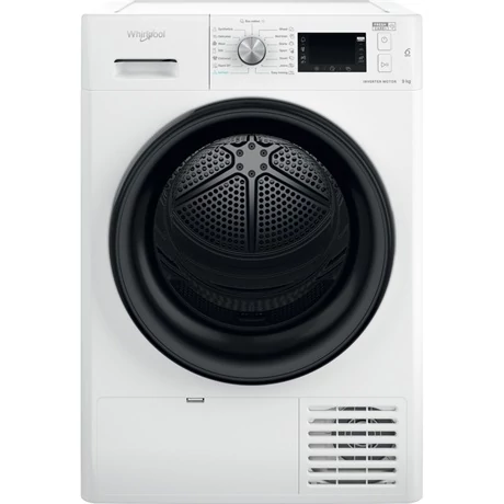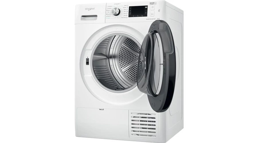 Hőszivattyús szárítógép, "A++" energiaosztály, 9 kg (pamut) szárítási kapacitás, nagy digitális kijelző, BPM motor, 6. Érzék funkció, fehér gép, fekete ajtó fekete kerettel.