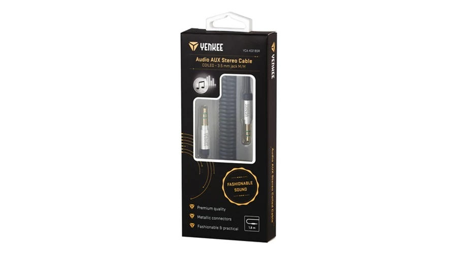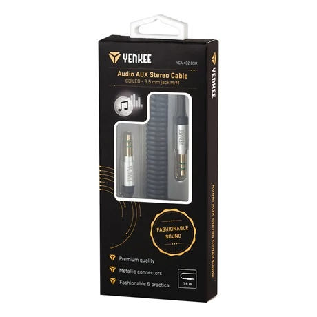 SZTEREÓ AUDIÓ AUX SPIRÁLKÁBEL 3,5MM-ES JACK CSATLAKOZÓVAL ÉS SZÍNES FÉMCSATLAKOZÓVAL.