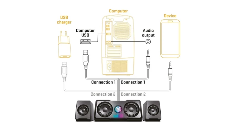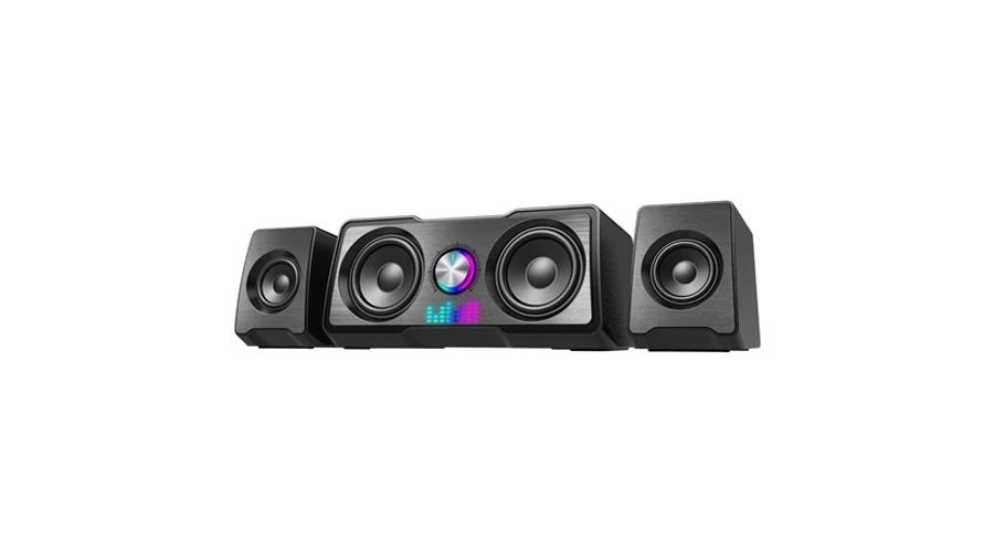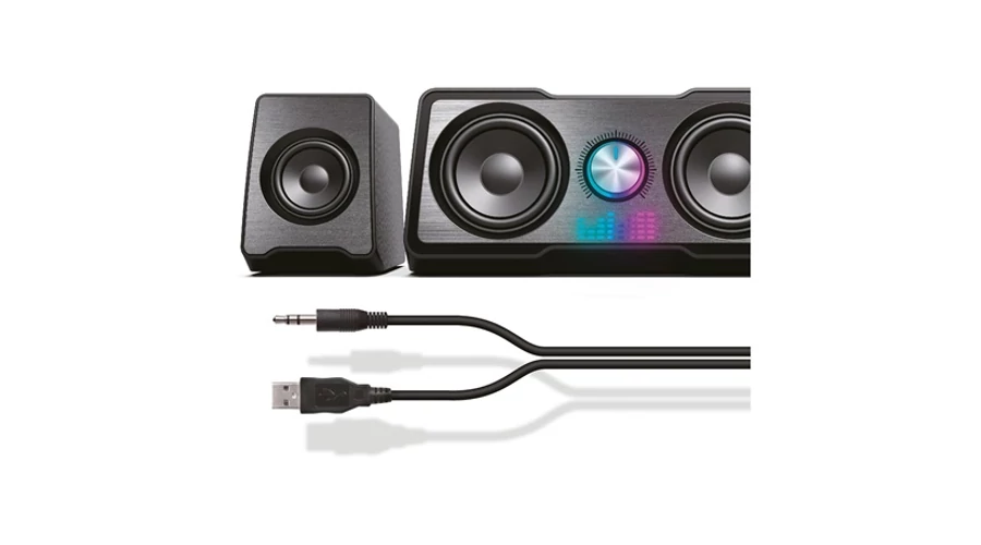 A legnagyobb előnyöm azonban az egyszerű vezérlőelemek, amelyeket még egy gyerek is képes kezelni. A minőségi hangzást egy 3,5 mm-es audiocsatlakozó biztosítja, amelyet egyszerűen csatlakoztathatsz a számítógép aljzatához. Ugyanez a helyzet a hangerőszabályzóval is, amelyet a mélysugárzó elején található nagy gombon keresztül vezérelhetsz. Az áramellátásról ezután egy USB-kábel gondoskodik, amely összeköti a hangszórókat és a számítógépet. Szóval csatlakozz és élvezd a zenét!